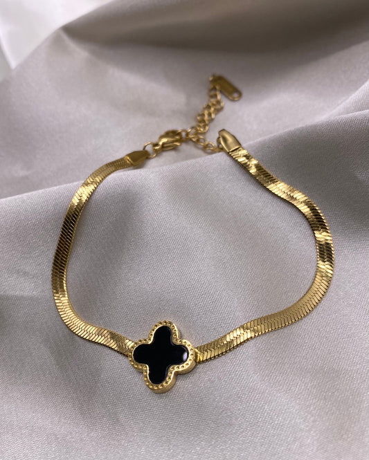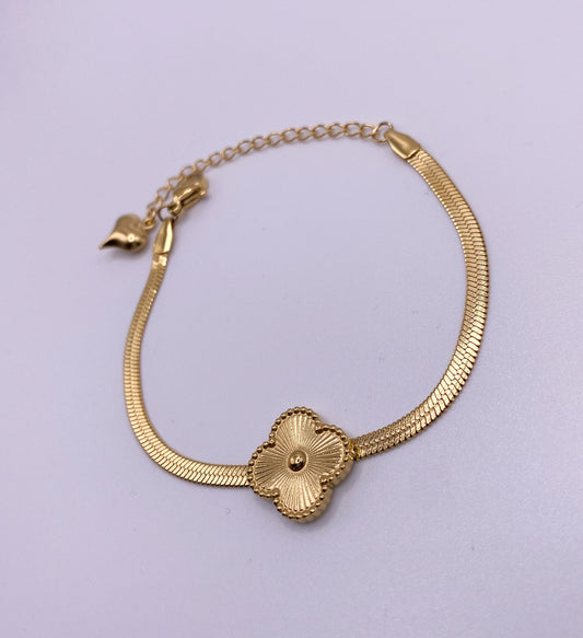 Four Leaf Clover Gold Herringbone Bracelet, Gold Clover Bracelet, Layering Snake Chain Bracelet, Waterproof, Flat Chain, Mother's Day Gift